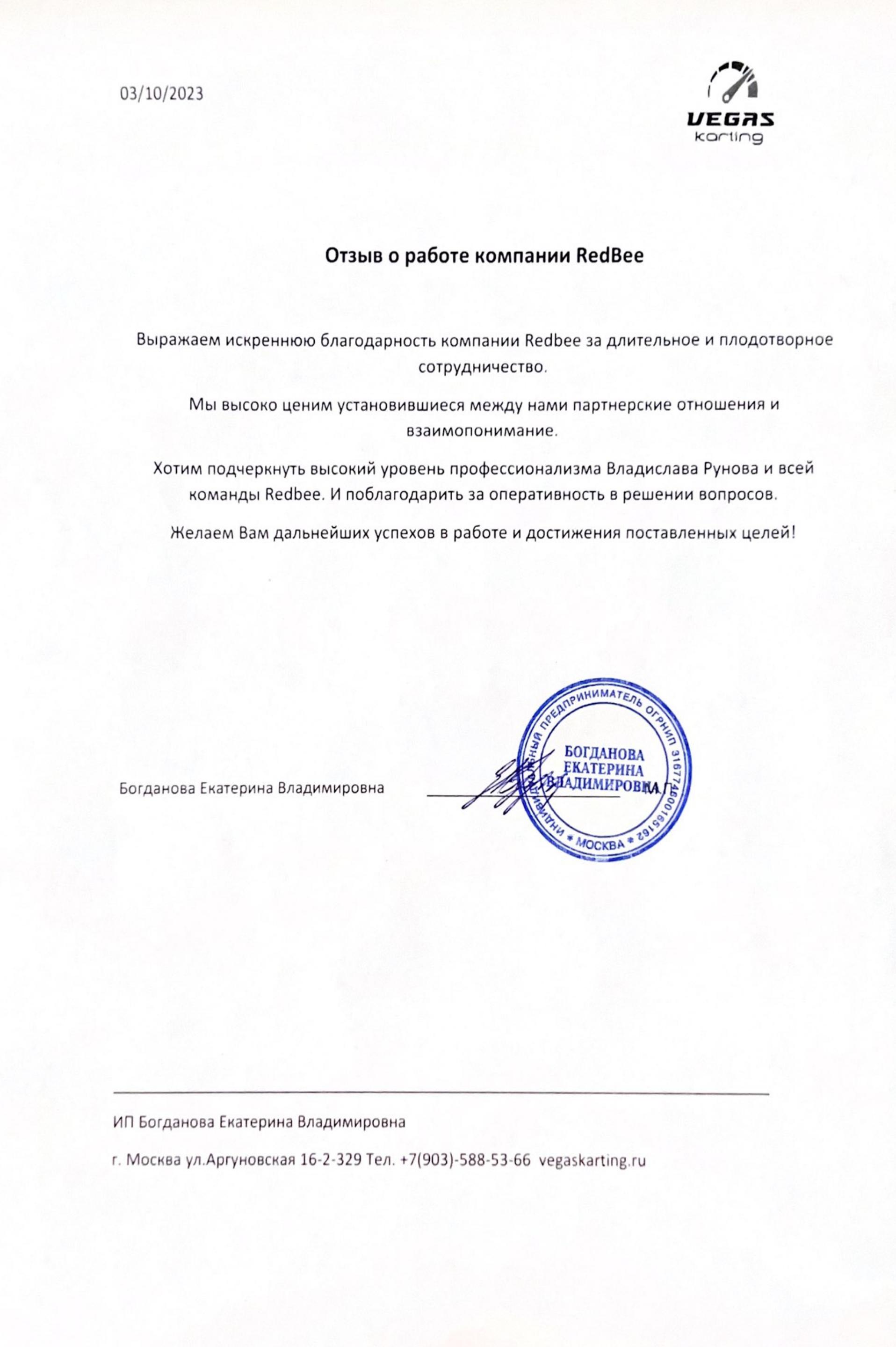 Выражаем искреннюю благодарность компании Redbee за длительное и плодотворное сотрудничество. Мы высоко ценим установившиеся между нами партнерские отношения и взаимопонимание. Хотим подчеркнуть высокий уровень профессионализма всей команды Redbee и поблагодарить за оперативность в решении вопросов.